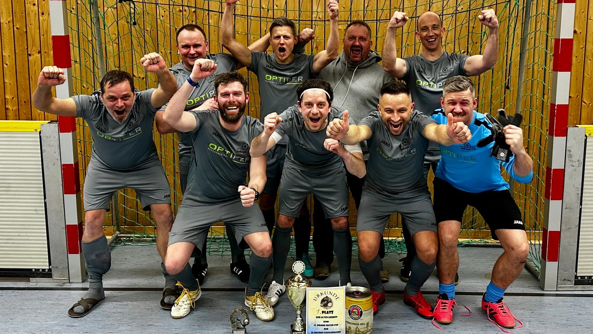 Abschließendes Spiel gegen den guten Gastgeber, immerhin hatten auch sie den Vorjahressieger Mikrofon Erfurt geschlagen, mit 3:1 gewonnen. Schnelle Führung durch Tino, prompter Ausgleich durch Emleben, aber die 12-Minuten Spielzeit sprach für uns. Viele Torchancen brachten am Ende zwei weitere Tore durch Tino und den hochverdienten und viel umjubelten Turniersieg.